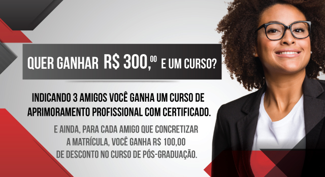 Indique a partir de trs amigos e ganhe um curso de aprimoramento profissional. Alm disso, para cada indicao que concretizar a matrcula em um curso de ps-graduao, ganhe R$ 100,00 de desconto e mais um curso de aprimoramento profissional a sua escolha.